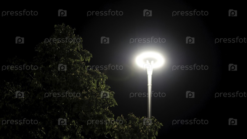 Ночь в городском парке и дерево на уличном фонаре.Нижний вид качающейся зеленой короны дерева под ярким светофором на фоне черного неба