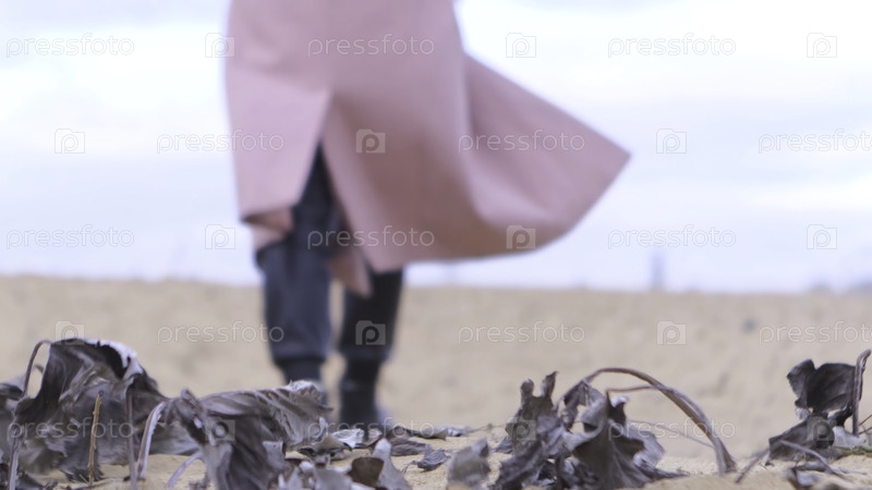 Сзади женские черные ботинки на песке, вид сверху. резервный кадр. Женщина в чёрных кожаных сапогах и розовом пальто идет к песчаному побережью со сухими листьями деревьев