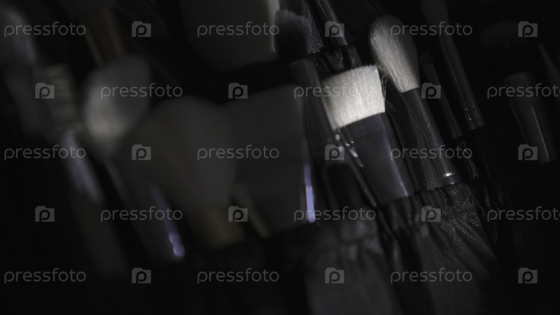 Многие разные косметические кисти под тусклым светом и фонариком, концепция индустрии красоты