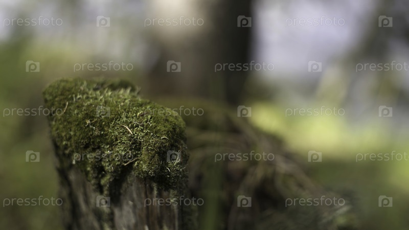 Закрытие зеленого моха на конопли дерева с размытым лесом в фоне, летняя концепция природы. резервные кадры. Старая колыбель древесины покрыта мохом