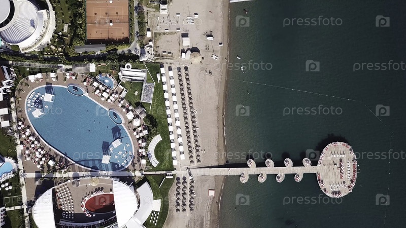 Отель Poolside с зонтиками и пальмами. Клип. Вид сверху. Бассейн вокруг пальм и зеленый сад в красивом тропическом курорте, с высоты птичьего полета