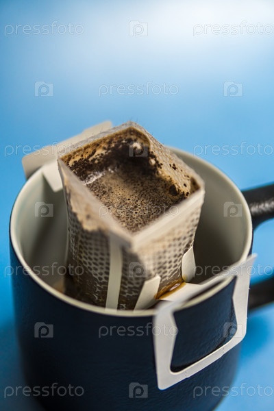 На этом изображении показано вид сверху вниз пакета капельного кофе в гладкой черной кружке, подчеркивая процесс приготовления