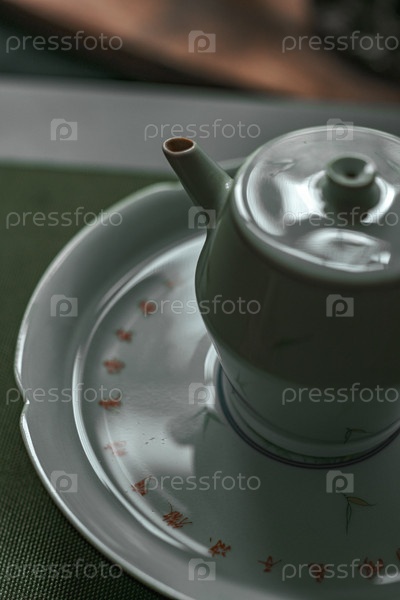 Красиво выполненный керамический чайник грациозно опирается на украшенную тарелку, что делает ее идеальной для любителей чая