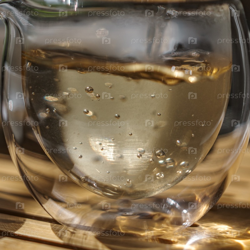 Близкий план газированного напитка в прозрачном стакане, показывающий яркие пузыри и мерцающие отражения