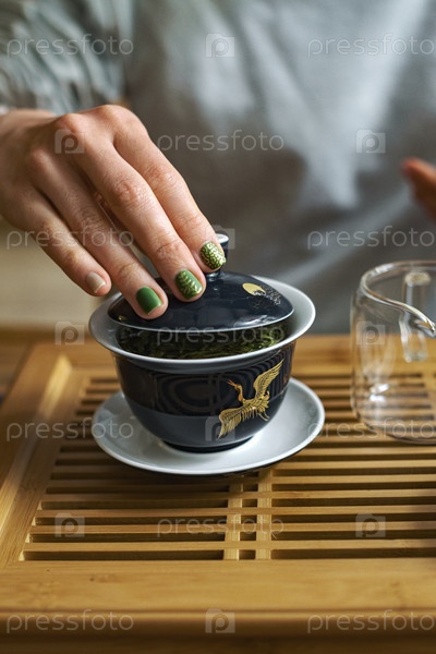 Нежная рука кладет крышку на красиво выполненную чашечку, идеально подходящую для любителей чая и их сознательного путешествия