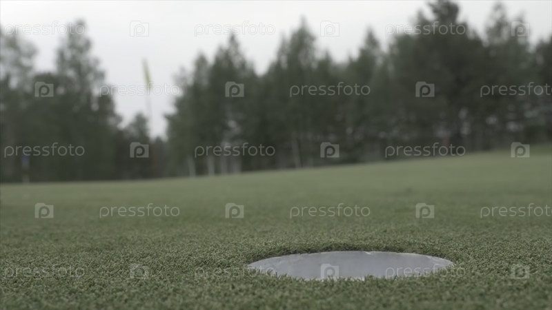 Мяч катится в яму. мяч для гольфа вот-вот упадет в дыру. мяч для гольфа прокачивается в отверстие на золотом поле в яркий солнечный день