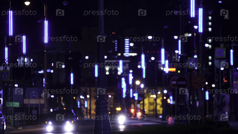 Футуристические городские огни ночью. Резервные кадры. Современное освещение дорог мегаполиса ночью. Футуристическое освещение ночного шоссе создает впечатление города будущего
