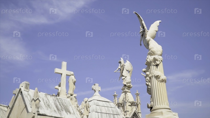 Ангелы и кресты на могильных памятниках на кладбище. продолжайте. белые каменные скульптуры и башни-креста против голубого неба