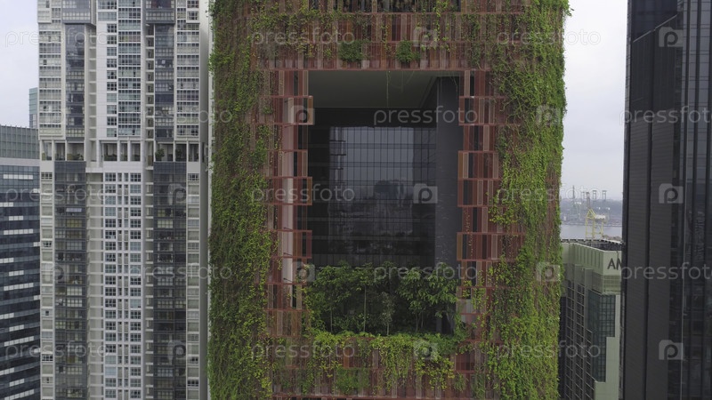 Висящие сады на красивом красном отеле в Сингапуре.Снимайте.Вид на красное здание с зеленью в Сингапуре