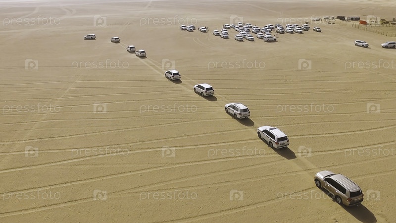 4х4 внедорожники ездят по песчаным дюнам в пустыне Абу-Даби