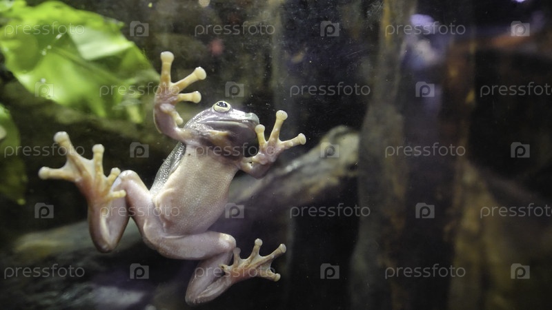 Тропическая зеленая лягушка в аквариуме Под водой африканская лягушка
