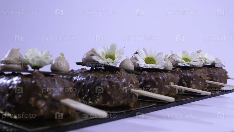 Цветы и сливки на мороженом крупный план. холодное мороженое на палочке. шоколадное мороженое на палке, украшенной цветами