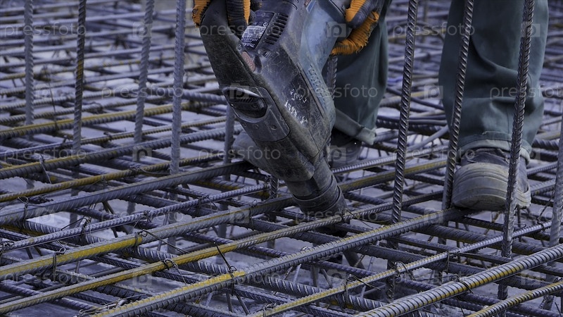 Рабочий на стройплощадке, делающий арматурную металлическую раму для литья бетона