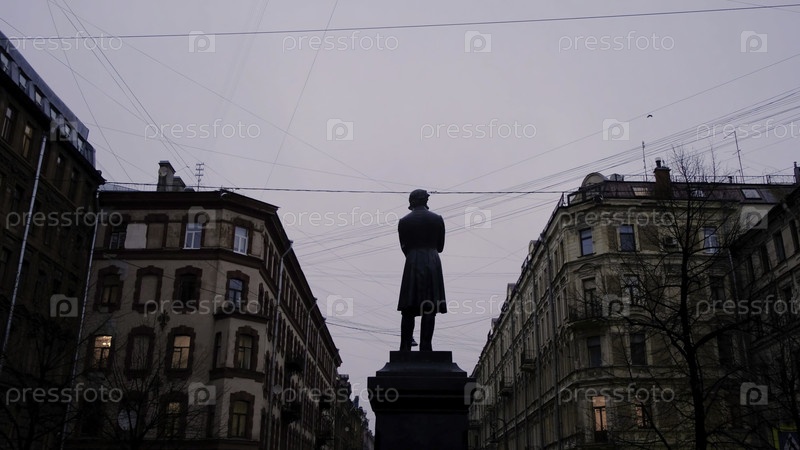 Статуя на фоне домов и облачного неба Концепция. Памятник стоит в центре города, окруженный домами против облачного неба