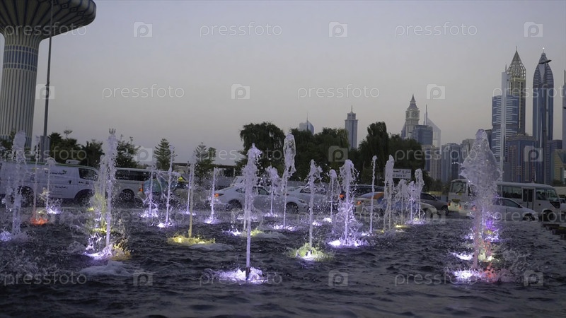 Красивый фонтан в Дубае для вечерней романтической музыки, танцев на воде, цветных огней, роскошного курорта, вечернего городского пейзажа