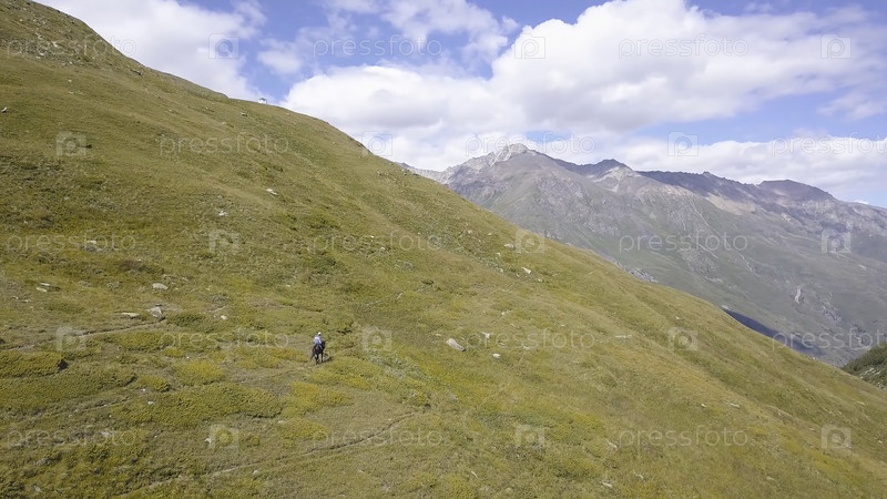 Вид человека, едущего на лошади в горах. Горный пейзаж с человеком на коне среди желтых склонов против синего неба. Всадник проезжает через горный перевал