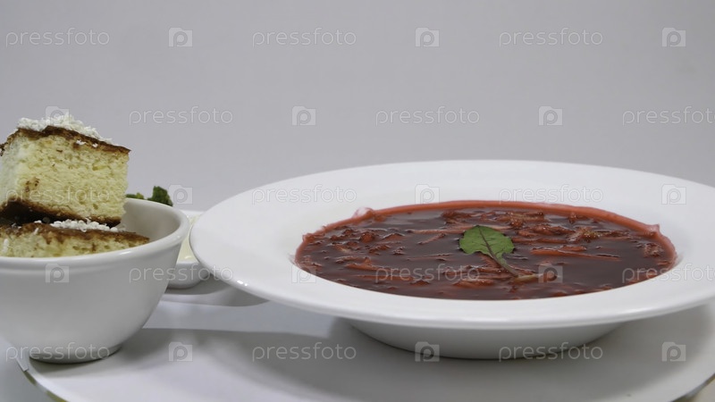 Красный борщ с мясом на тарелке. Вкусный красный борщ со сметаной и травами на белом блюде. Традиционный украинский суп из свеклы - красный borscht и пельмени с чесноком 4K