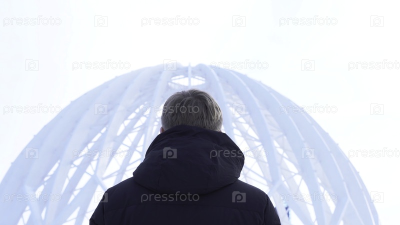 Вид на человека, который смотрит на здание купола.СМИ.Вид сзади мужчины, учитывая архитектурную структуру открытого купола против неба