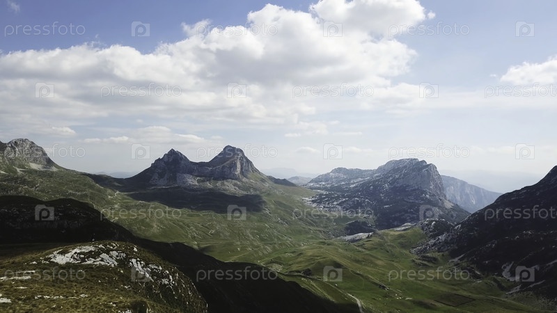 Вид сверху на горную панораму. Сток. Солнечный день с облаками в горах. Впечатляющий пейзаж гор и скал. Горная долина со скалистыми скалами