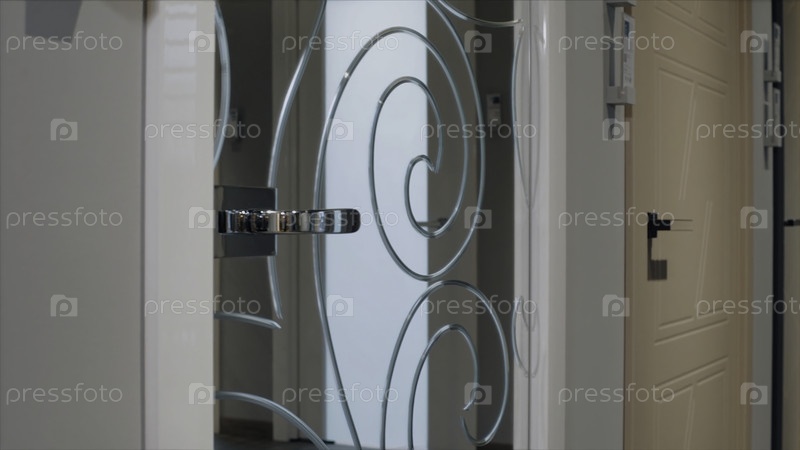 Видео. Закройте стеклянную зеркальную дверь с завитками и серебряной ручкой, детали дизайна интерьера