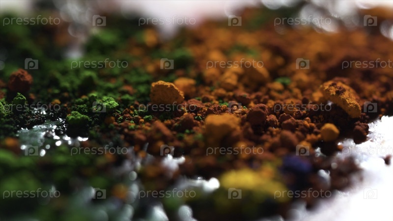 Закрытие различных цветов сухим чернилом, художественная концепция. яркий радужный фон с оранжевым, зеленым и желтым порошком