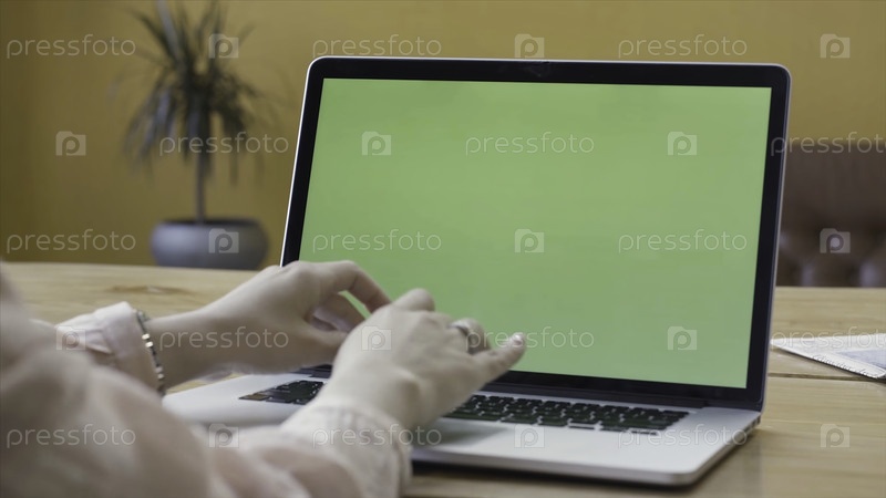 Над плечом вид женских рук, использующих ноутбук с зеленым экраном. резервные записи. Женские руки, печатающие на клавиатуре ноутбука, бизнес-хромаки, коммуникации, фриланс и концепция Интернета