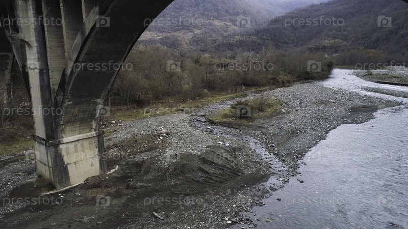 Воздух старого заброшенного моста через почти высохшую реку, проблемы окружающей среды и концепция изменения климата.Стреляйте.Летать над бетонным мостом и узким ручьем в горной местности