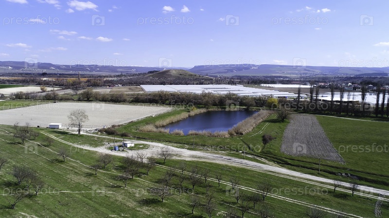 Красивый пейзаж с зелеными лугами, небольшими редкими деревьями на голубом облачном фоне неба