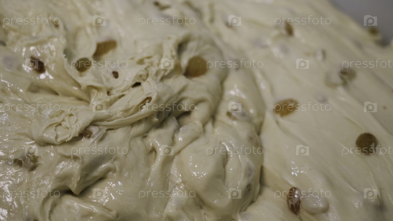 Близко к смешанной выпечке с изюмом в металлической таре, питательная концепция питания. сырое тесто для пирогов или хлеба