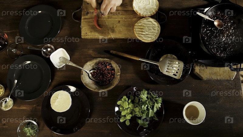 Руки шеф-повара готовят и используют сыр Камемберт, красный перец чили, петрушку, сельдерей и соусы, эффект временного провала
