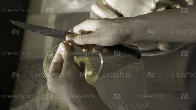 Покройте кухонным ножом женщины, режущие чеснок. идите дальше. вид сверху на женские руки, разрезающие чеснок и бросающие его в глубокую стеклянную тарелку, стоящую на столе, кулинарная концепция