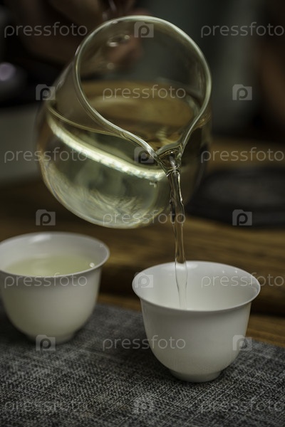 Спокойный момент запечатлен, когда чай мягко наливают в чашки, символизирующие спокойствие и дорогую традицию