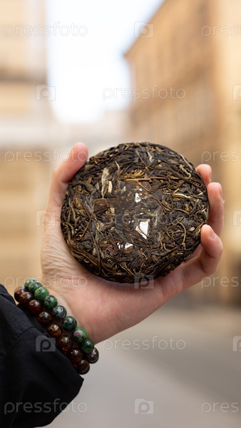 Мужчина держит сжатый чайный торт на слегка размытом городском фоне, демонстрируя естественную красоту