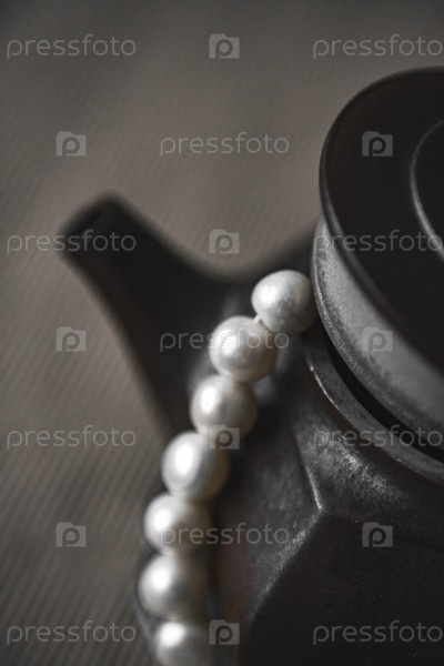 Элегантный черный чайник красиво сочетается с потрясающим жемчужным ожерельем, добавляя шарм
