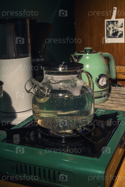 Чайник опирается на плиту, как пузырьки кипящей воды в уютной кухне, создавая душевный покой
