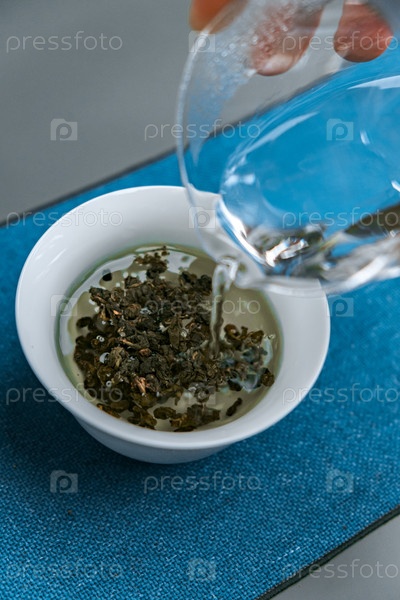 Рука, наливающая горячую воду в миску бесплатных зеленых листьев чая, демонстрирует успокаивающий процесс приготовления чая