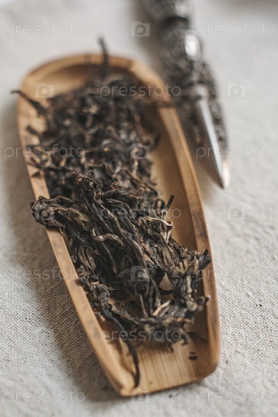 Сушеные чайные листья элегантно расположены на красивом деревянном подносе в сопровождении декоративной ложки для подачи