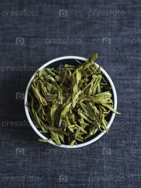 Чаша с сухим зеленым чаем красиво расположена на фоне темной ткани