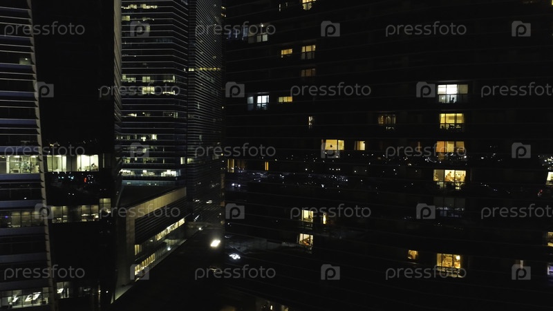 Вид на горизонт города с небоскребами в переднем плане ночью.Снимайте.Вид на многоэтажные здания в центре мегаполиса ночью
