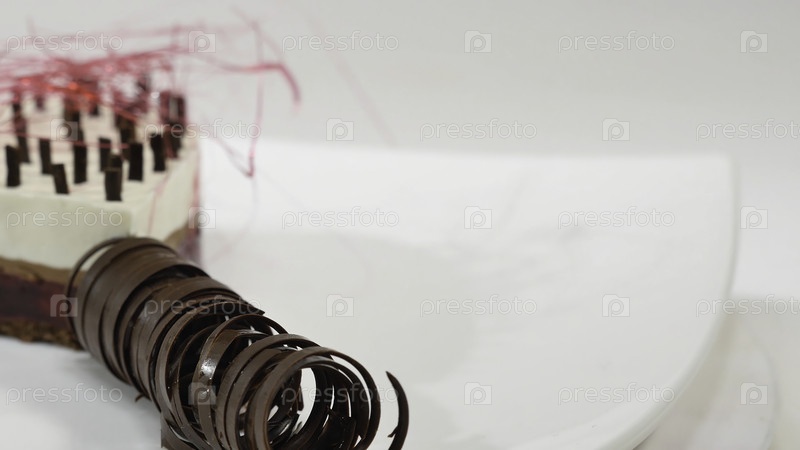 Кремовый торт с тремя слоями на тарелке, украшенный шоколадными крохи и 4K-шоколадной соломой