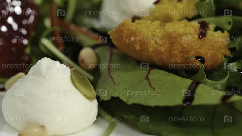 Итальянский салат из жареной свеклы. Жареный салат из свеклы с козьим сыром и сосновыми орехами на белом блюде, изолированный на белом фоне. Таглиателле с свеклой и сыром на тарелке, мягкий фокус