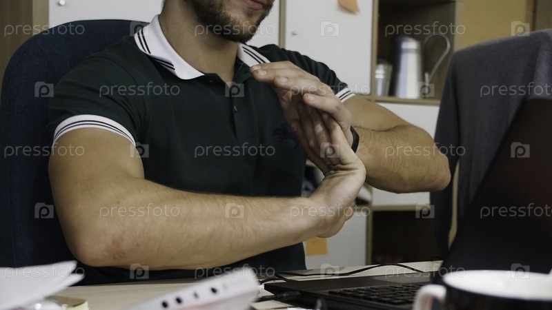 Бизнесмен делает разминку в офисе. Офисный работник выполняет упражнения руками. Во время тяжелого рабочего дня офисный сотрудник изгибает пальцы