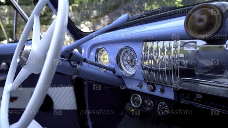 Винтажный ретро-интерьер машины.Продолжайте.Красивый дизайн синего ретро-автомобиля.Интериор автомобиля
