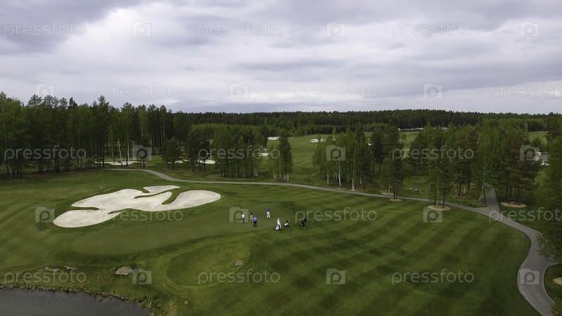 Игроки в гольф снимают голф с клюшкой на курсе во время летних каникул