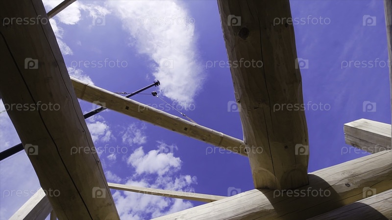 Кран поднимает бревно.Клип.Кран поднимает древесину, чтобы построить деревянный дом