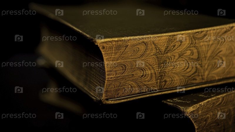 Закройте старую толстую книгу, лежащую на плоской поверхности, изолированную от черного фона. резервные кадры. Вид на край древней книги со старыми золотыми страницами