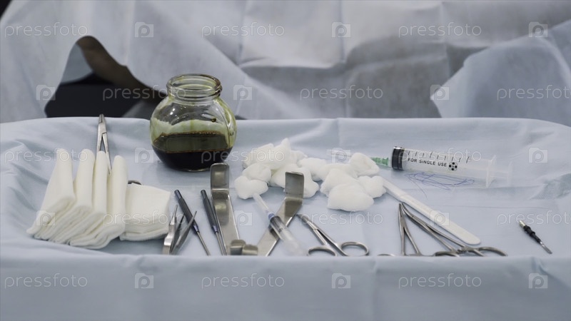 Закрытие медицинских инструментов, чашка с йодом и белые хлопковые шарики и стерильная марля - концепция медицины