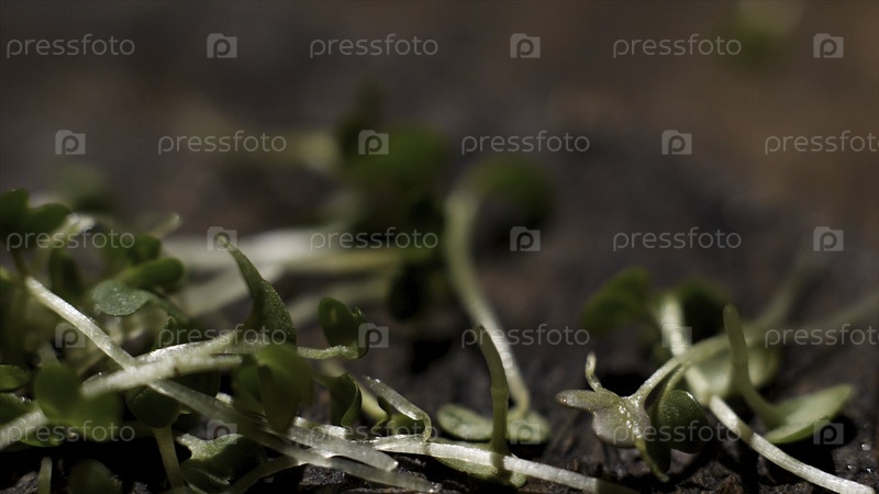 Витамин диетический микрозелёная горчица падает на деревянную рустическую поверхность, пищевая и гастрономическая концепция. резервные кадры. Закройте свежие зеленые побеги горчицы на деревянном столе