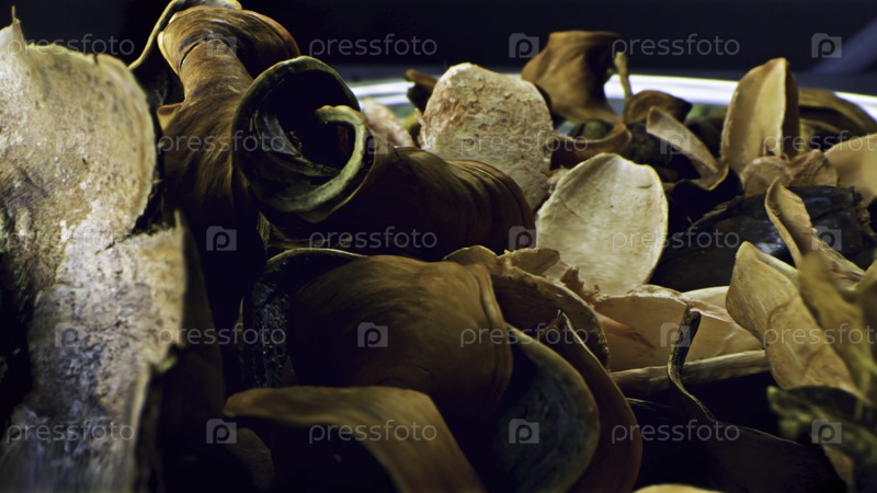 Закройте сушеные растения и фрукты. резервные кадры. Различные высушенные листья растений, плодов и кору деревьев для приготовления чая или лекарственного бульона подчеркиваются на черном фоне