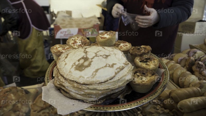 Рядом с прилавком продукты из муки: блины, колбасные роллы, различные пироги на уличном рынке или ярмарке под открытым небом, концепция питания